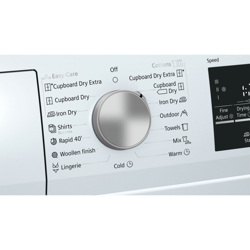 • tlačidlá touchControl: štart/pauza, šetrný, akustický signál, ochrana proti pokrčeniu, dĺžka programu, nastavenie jemného výsledku sušenia, 24 hod. odloženie konca programu