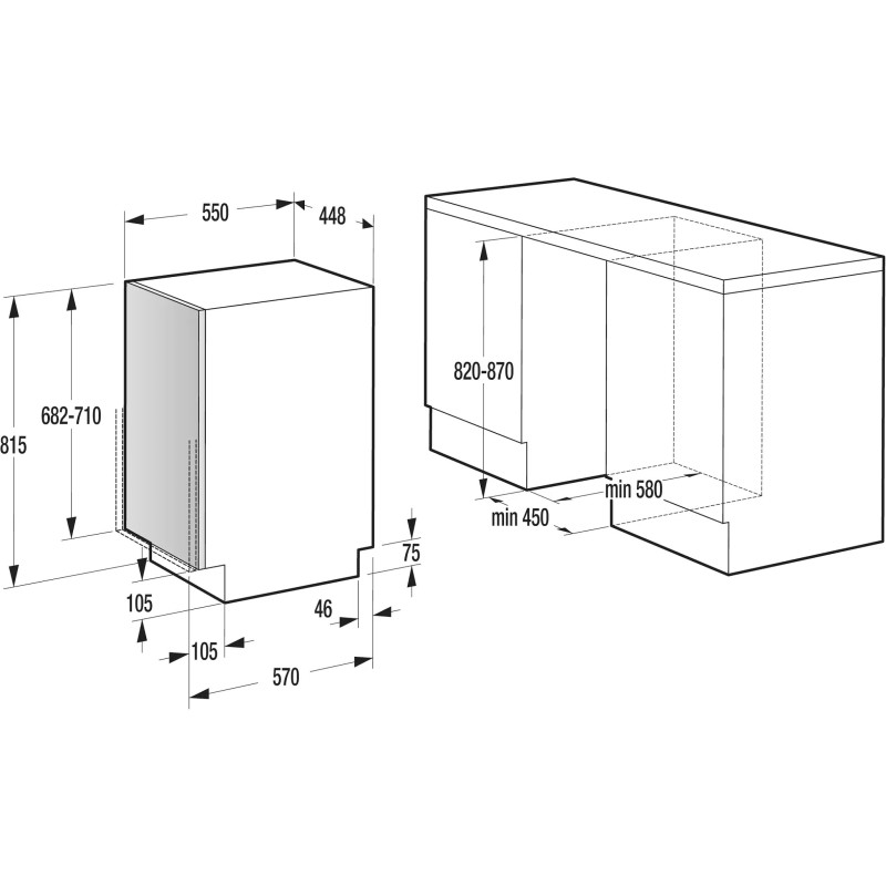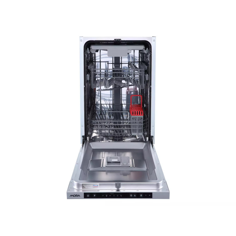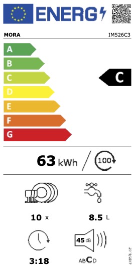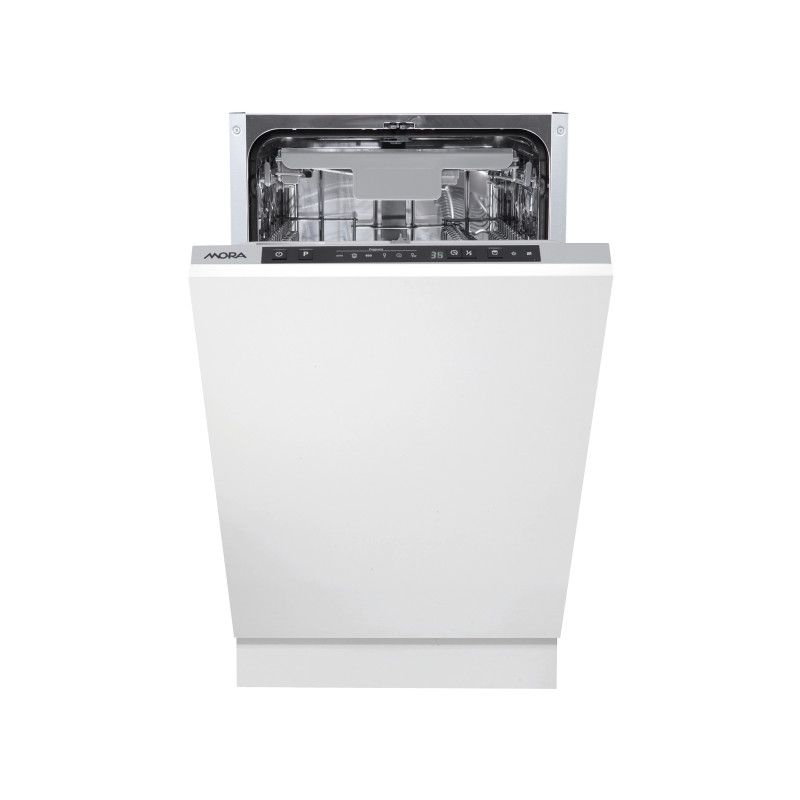 Vstavaná plne integrovaná umývačka; šírka 45cm, 10 súprav riadu ; 3 úložné koše (príborová zásuvka); 6 programov: AUTO; rýchly; intenzívny; intenzívny krátky; ECO; sklo; teploty : 65, 60, 55, 45, 40 °C; funkcia polovičné plnenie; funkcia SušeniePlus – automatické pootvorenie dverí na konci programu; funkcia tablety 3v1; odloženie štartu (0–24 h); funkcia Total Aqua Stop proti pretečeniu; en. trieda: C; hlučnosť: 45 dB(A) re 1 pW; spotreba energie: 63 kWh/100 cyklov; spotreba vody: 8,5 l/cyklus; maximálna teplota vstupnej vody 60 °C