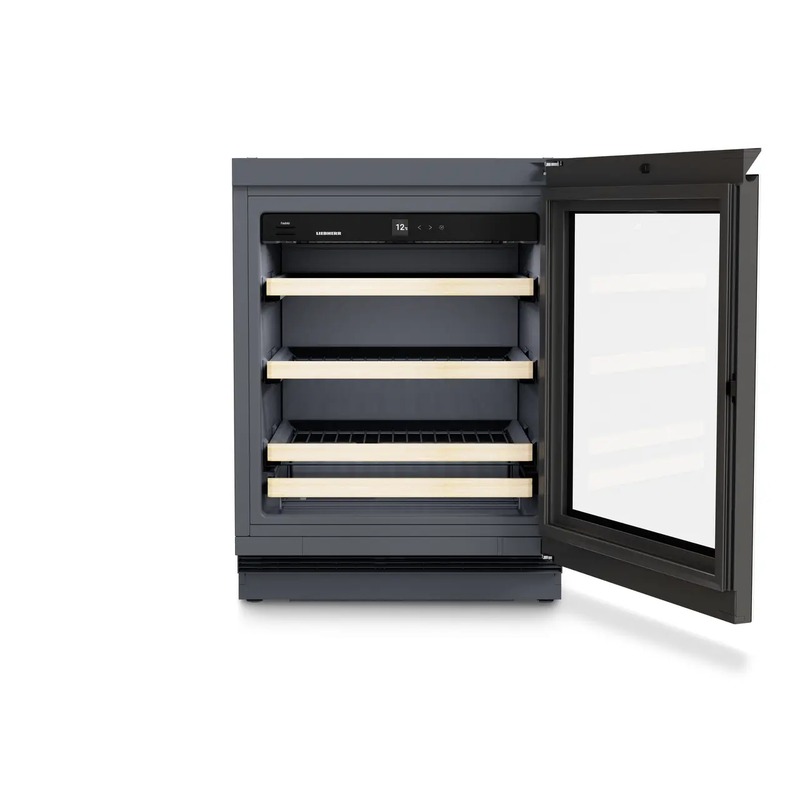 Vinotéka podstavná - jednozónová, objem 110l, 44 lahví, 36dB(A), vnitřní prostor Antracit, 4x rošt z bukového dřeva, 3x teleskopické pojezdy, zapuštěné madlo, černé sklo