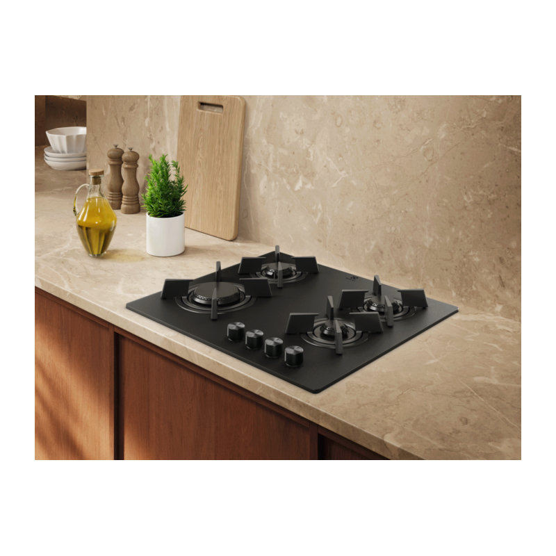 Táto plynová varná doska s elegantne matne čiernym povrchom je vyrobená z temperovaného skla, ktoré je odolné voči odtlačkom prstov, ľahko sa čistí a zachováva si svoju krásu. Dokonale sa hodí k príslušnému digestoru a vytvára modernú a nadčasovú kuchyňu.