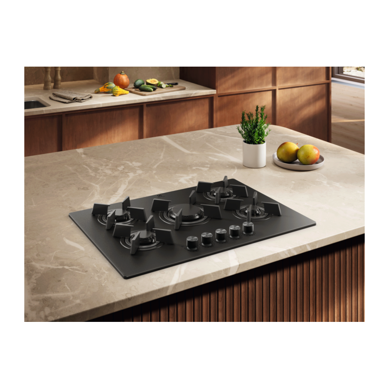 Táto plynová varná doska s elegantne matne čiernym povrchom je vyrobená z temperovaného skla, ktoré je odolné voči odtlačkom prstov, ľahko sa čistí a zachováva si svoju krásu. Dokonale sa hodí k príslušnému digestoru a vytvára modernú a nadčasovú kuchyňu.