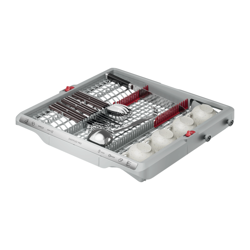 Koše EasyFlex Pro sa plynulo vysúvajú a všetky časti sa dajú sklopiť pre maximálnu flexibilitu. Protišmykové gumové úchyty a hroty bezpečne držia poháre na stopke aj ostatné poháre a bránia ich vzájomnému narážaniu. Do zásuvky na príbor sa zmestia metličky, naberačky aj malé šálky.