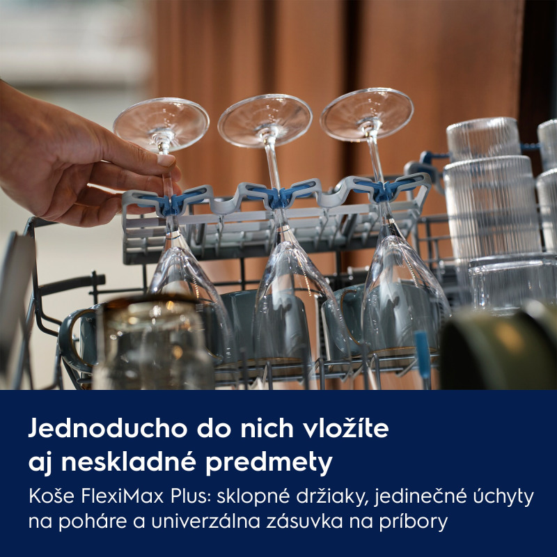 Do košov FlexiMax Plus s hladkým výsuvom a tromi sklopnými držiakmi pohodlne naložíte svoj riad. Protišmykové gumené úchyty a hroty zaistia poháre na stopke aj bežné poháre, čím sa znižuje riziko ich vzájomných nárazov. Zásuvka na príbor má hlbokú strednú časť na kuchynské náradie.
