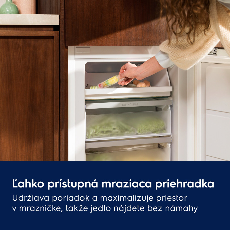 NoFrost zabraňuje tvorbe námrazy v mrazničke cirkuláciou suchého vzduchu. Nikdy nemusíte ručne odmrazovať — úspora času a potraviny sa nezlepujú námrazou. Nevýhodou je o niečo vyššia spotreba energie a to, že potraviny bez obalu rýchlejšie vysychajú. Pre moderné domácnosti je NoFrost prakticky štandard.