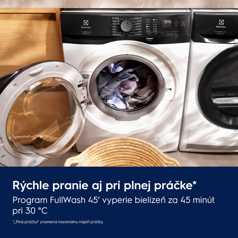Program FullWash 45': Dokončí pranie za 45 minút pri 30 °C aj pri plnej náplni. Program je ideálny pre bežné náplne mierne znečisteného, každodenného oblečenia, zmiešaných tkanín a farebnej bavlny.