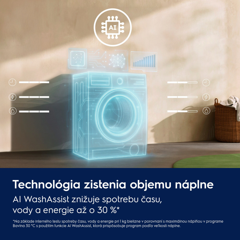 AI WashAssist: Pomocou algoritmu umelej inteligencie dokáže pokročilá technológia rozpoznávania veľkosti náplne SensiCare upraviť čas cyklu, množstvo vody a spotrebu energie* a znížiť ich až o 30 %**