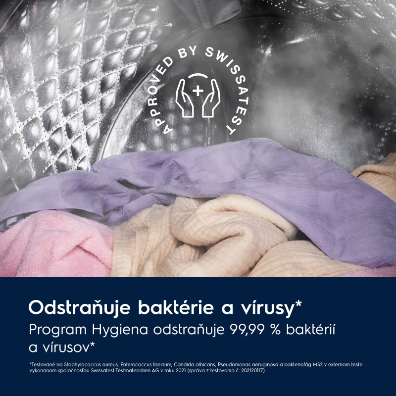 Náš parný program Hygiena s certifikáciou Swissatest kombinuje cyklus prania a pary na odstránenie viac ako 99,99 % baktérií a vírusov* pri praní nad 60 °C. Tiež redukuje peľ a alergény a zaisťuje, že oblečenie bude pri každom praní hygienickejšie a čistejšie.
